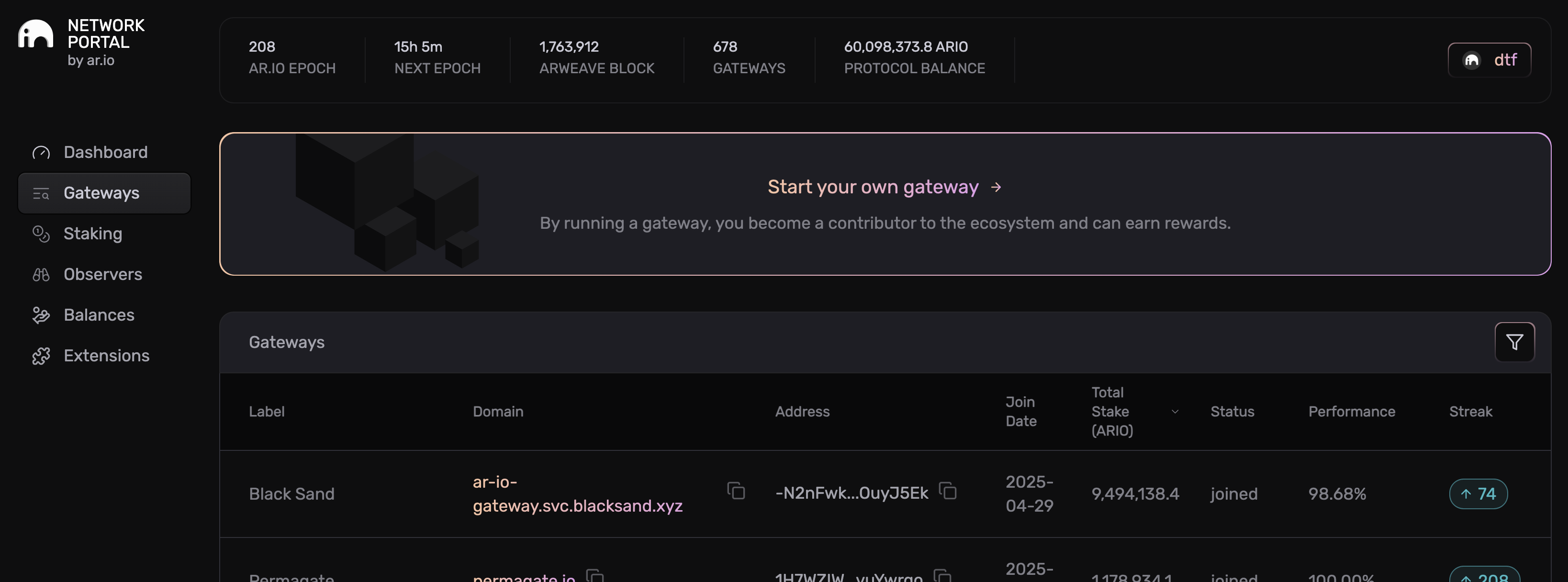 Take control of the permanent web by running your own ar.io Gateway. Join the decentralized network that powers the permaweb and earn rewards for providing infrastructure services.