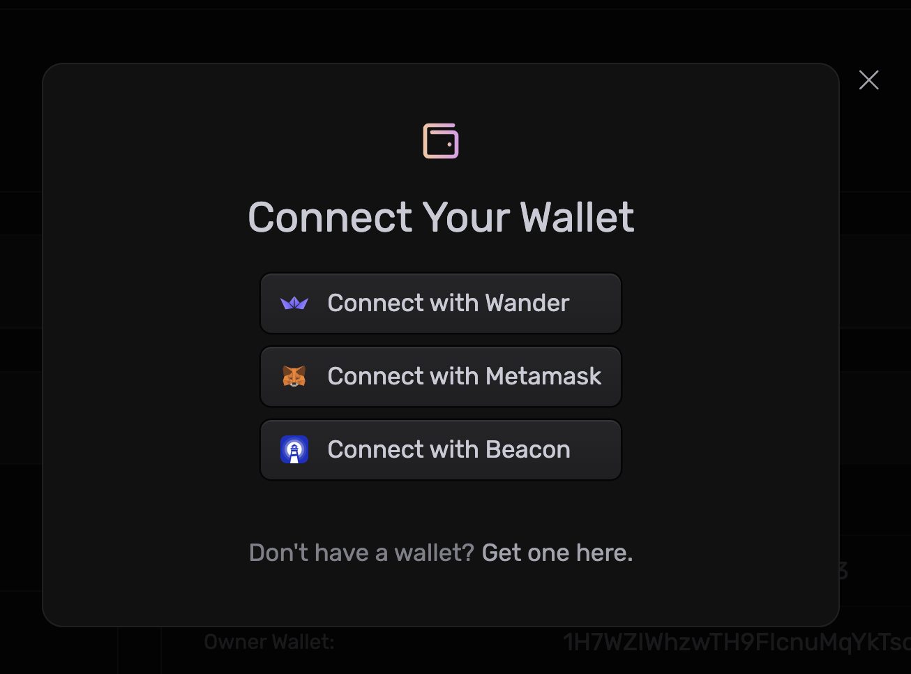 Choose your preferred wallet (Wander, Metamask, or Beacon) to connect.