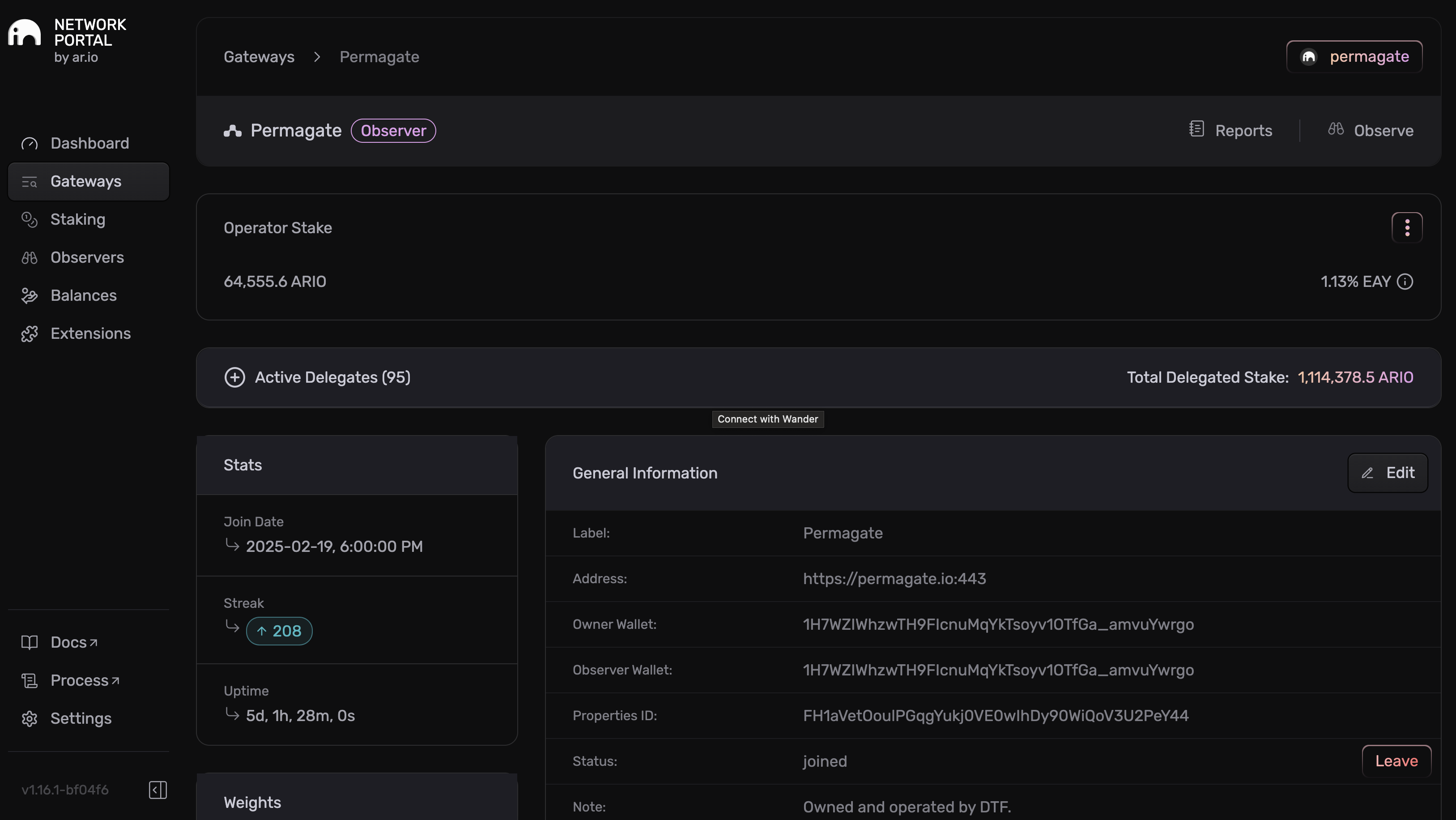 This dashboard shows your gateway's information, stats, and performance metrics including join date, uptime, operator stake, and delegated stake details.